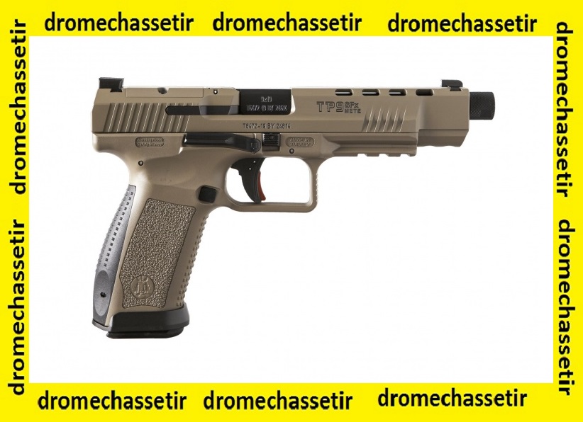 Sa finition est en type Cerakote FDE et pour un rechargement plus rapide, un puits de chargeur en aluminium est fixé sur sa poignée.