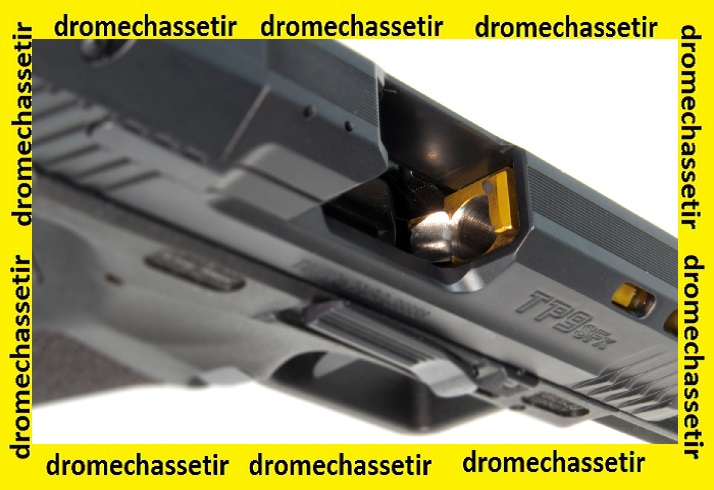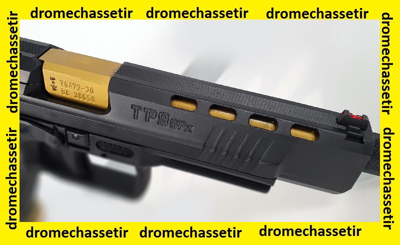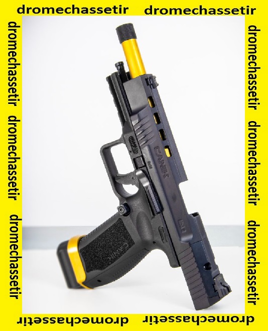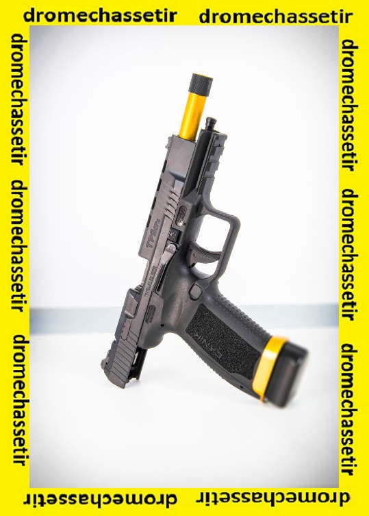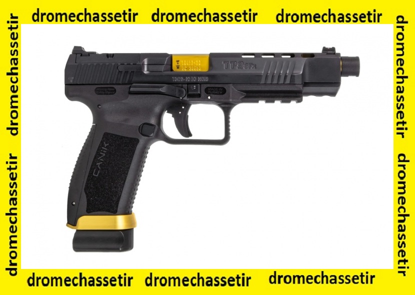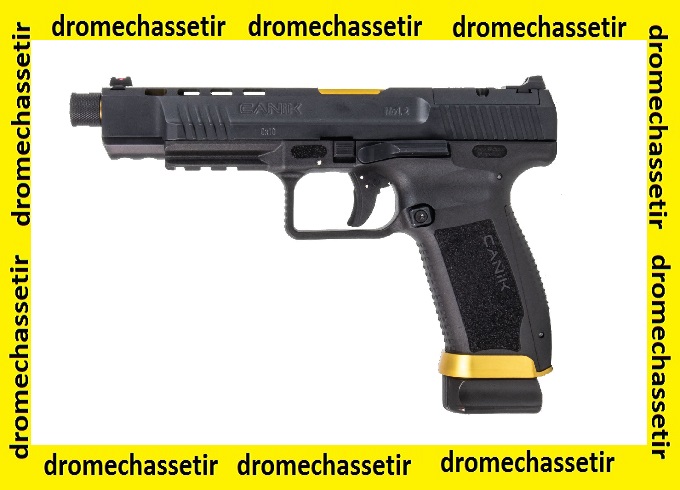 Le pistolet Canik semi automatique modele TP9 SFX Mod2 Tungsten,possede un canon fileté de 146mm soit 5.75″ : le TP9 SFX Custom Gold / Black.