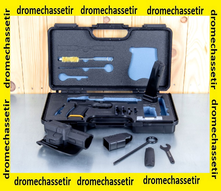 Il est aussi livré avec 4 platines de fixation permettant la pose de différents micro-viseurs. Une platine est uniquement dédiée à la fixation de sa visée ouverte. Un levier d’armement, deux chargeurs 20 coups, une chargette, un étui en polymère à rétention, deux dos de poignée, une mallette de transport sont également fournis.