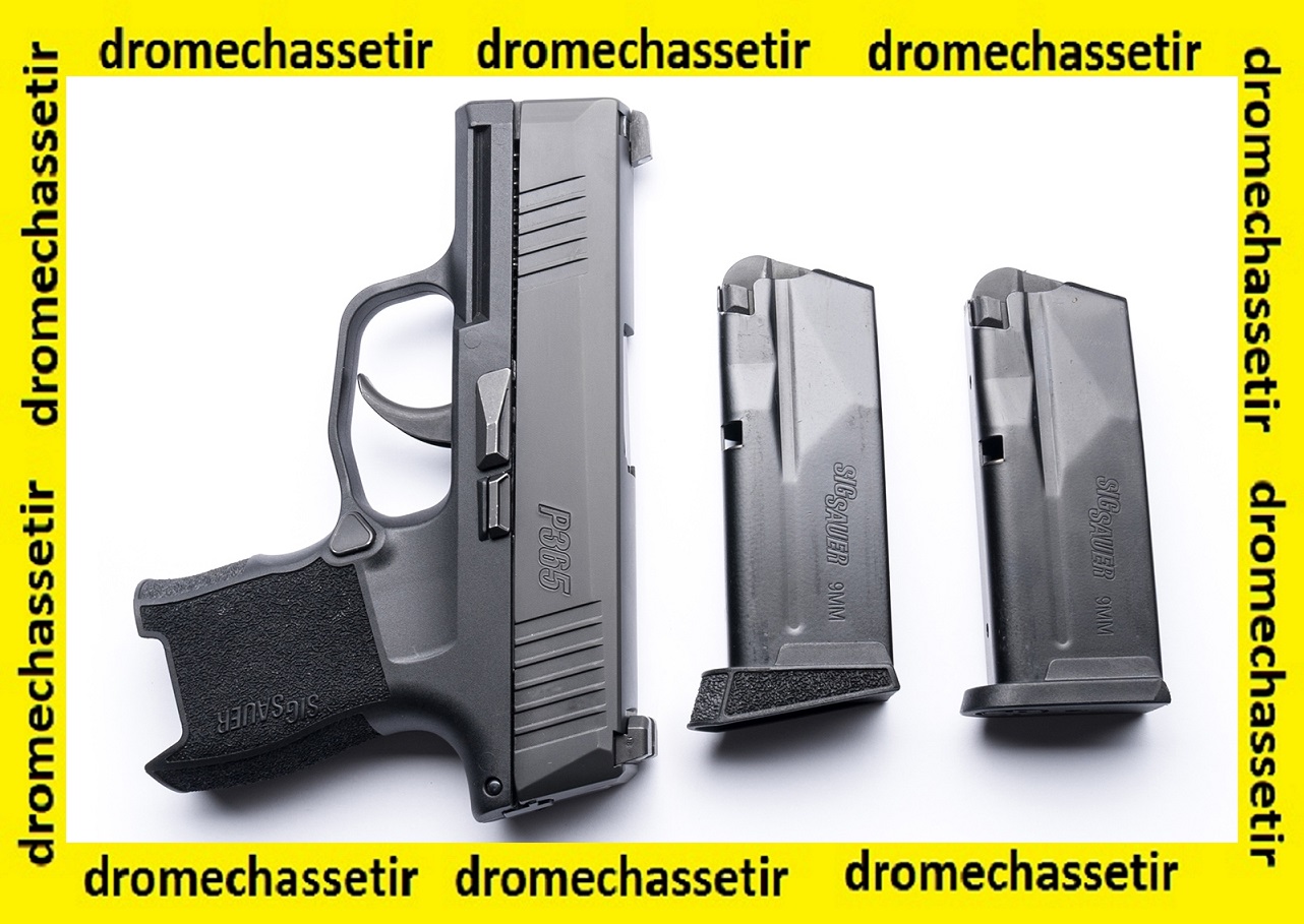 Le P365 est chambré en calibre 9 mm Luger et peut utiliser des munitions +P. Il est livré avec deux chargeurs : un 10 coups standard et un 10 coups étendu. Notez qu’un chargeur 12 coups est disponible en option, portant la capacité totale à 13 coups (12+1).