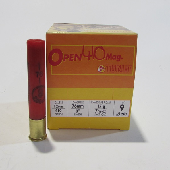 boite de 25 cartouches cal 410 magnum (cal 36) tunet open , une charge de plombs de 17 grammes avec bourre jupe en plombs numero 9