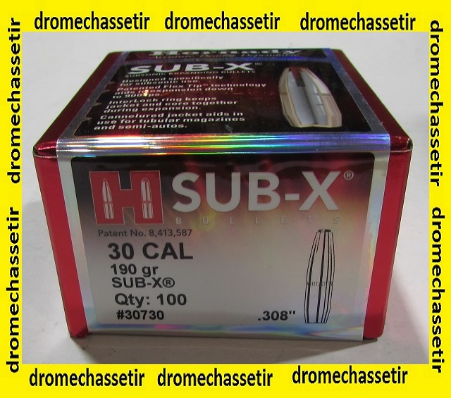 boite de 100 ogives Hornady modèle SUB-X en 190 grains pour le tir subsonique pour les calibre 30 comme le 308win, 300 Win Mag, 300 AAC Blackout